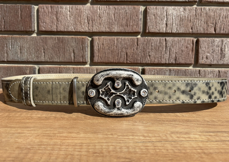 Пряжка изготовлена из прочного металлического сплава цвета состаренное серебро, пряжка украшена четырьмя крупными стразами высокого качества. Габариты: 93х74 мм.