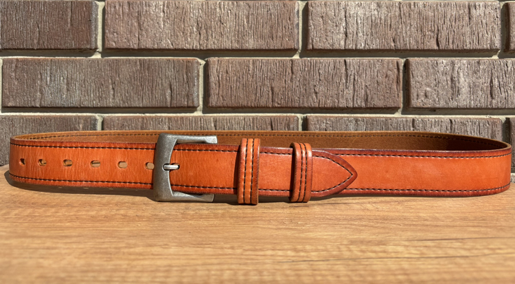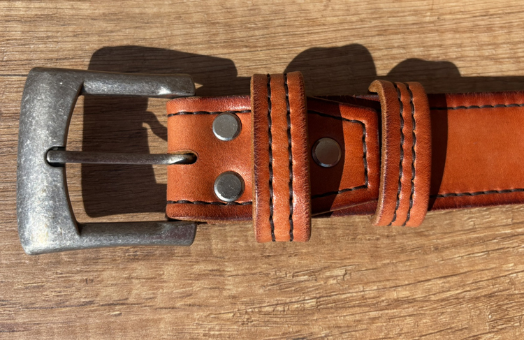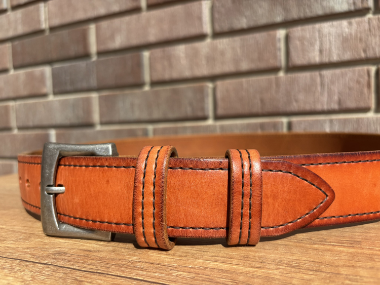 Края ременного полотна обработаны Tokonole и заполированы воском Columbus Прошиты вощеной плоской нитью Galaces 1 мм, что увеличивает срок службы и прочность ремня.