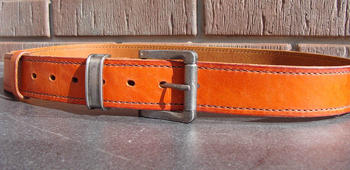 Края ременного полотна обработаны Tokonole и заполированы воском Columbus Прошиты вощеной плоской нитью Galaces 1 мм, что увеличивает срок службы и прочность ремня.